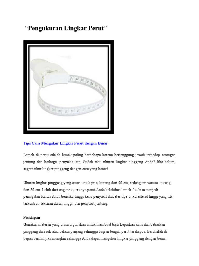 Cara mengukur lingkar pinggang cara melakukan pengukuran lingkar pinggang yang benar adalah sebagi berikut. Mulailah pengukuran dari bagian atas tulang pinggul. Untuk pemesanan jas dan baju pria yang perlu diukur adalah : Diukur dari ban pinggang sebelah kanan kebawah sampai bagian bawah batas mata kaki atau sesuai kebutuhan. Mempertahankan lingkar pinggang adalah cara penting untuk mencegah serangan jantung dan stroke di masa depan, terlepas dari para peneliti pun menekankan bahwa ukuran lingkar pinggang merupakan penanda yang lebih rinci daripada obesitas, dan menyarankan dokter untuk mengukur.